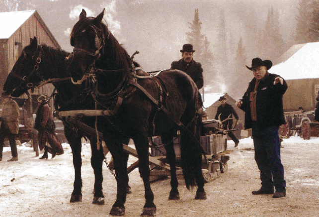 From left: Scott organizing a day of filming; buffalo wranglers and John near Drumheller; on the set of Into the West.